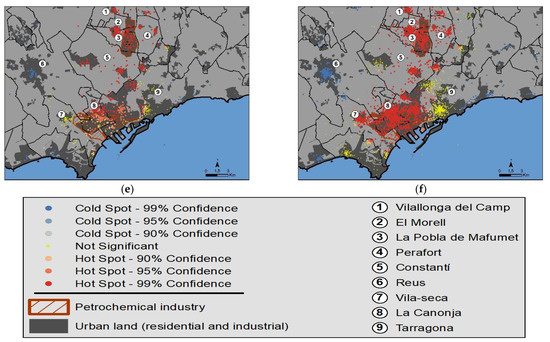 The map of the territorial distribution of the affected areas in the event of a petrochemical accident (Figure 6) shows certain similarity to the map of the emission areas: the points with the highest risk are distributed both inside the industrial estates themselves and in the nearest town centers. Particularly relevant is the distribution of points that would be affected by a hypothetical explosion, which is, without a doubt, the perceived risk with greatest territorial repercussion (Figure 6a). An opposite situation is that of the possible areas affected by fire, perceived as much more territorially limited risk (Figure 6b). Finally, it is worth highlighting the high number of opinions that identify locations that would be affected not only by a particular type of risk, but also by the total risk (Figure 6f). Again, it is worth pointing out that Reus and its nearest city environment, due to its peripheral position with respect to the areas with greater industrial concentration, is perceived as a safe space vis-à-vis most of the risks (Figure 6).