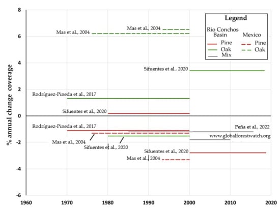 Percent annual change of forest cover reported for the Rio Conchos basin (solid lines) and Mexico’s temperate forests (dashed lines) [26,30,32,38,40].