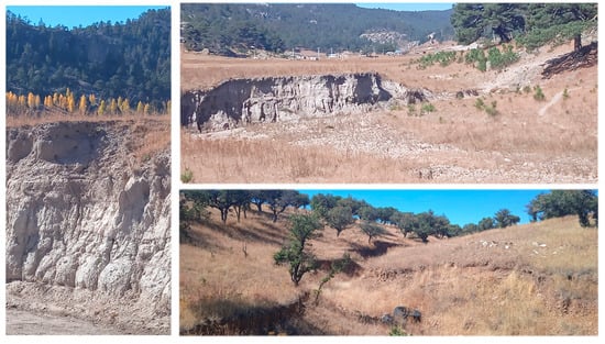 According to official reports, in 2001–2002 [42], 12% of the total surface area of the state of Chihuahua was affected by hydric erosion and 25.9% by eolic erosion. Hydric erosion results in the deformation of the ground (Figure 4) and the reduction of topsoil [31]. Reports on hydric erosion within the Rio Conchos basin are listed in Table 2. Soil loss in the years 1980, 2000, y 2018 after high to very-high rates of erosion affected 0.060, 0.018 y 0.100% of the total basin surface, respectively [38]. The year 2018 was very susceptible to soil erosion, with 6718 ha of the affected area after experiencing a runoff five-fold those of the year 2000 and twice those of 1980 [38].