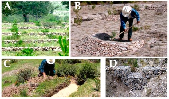 Preparing terraces for reforestation. (A) stone barriers, (B) water catchment, (C) trench ditches, and (D) filter dam [47].