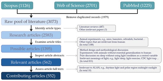 In the second phase of the literature review, three steps were taken to remove irrelevant research articles. In the first step, we examined the titles of the research articles to remove works on animals, which include mice, hamsters, zebrafish, bacteria, and others. In the second step, we read the abstracts of the remaining articles and removed papers that are not about light, such as those on research design and methodological issues, pure discussion on sleep without using light conditions as a control variable, and other irrelevant articles involving the word “light”, e.g., light sleep and light exercise. In the final step, we assessed the full text of the remaining articles and removed several that do not fit the scope of this review (e.g., the health effects of daytime light and polar region midnight sunlight). In the second phase, three experienced reviewers were in charge of one-third of the initial collection of research articles, respectively. The results from one reviewer were examined by the other reviewer until they reached an agreement. The result yields a collection of 552 relevant research articles, all the materials were stored as a digital library using EndNote 20.