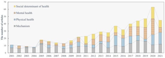 In this section, we present our systematic evidence map in detail. In the following subsections, we first summarize the development of this research in the last two decades according to the attributes of the included research articles. The effects of ALAN on human physical and mental health are then summarized. We also summarize the role of ALAN as an environmental factor and social determinant of human health, including both its direct and indirect effects. Finally, we propose a multi-component framework to systematically classify these diversified studies.
