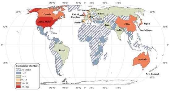 Through our generalized search and systematic screening, we finally selected 552 research articles on ALAN’s health effects (Figure 1). Since the early papers that link ALAN with breast cancer in the 1980s [20] works on how ALAN may affect human health keep drawing attention from multiple disciplines, especially in the last two decades (Figure 2). These studies are mostly concentrated in countries with well-developed nightscapes (Figure 3), such as the United States (217 studies), Japan (36), Australia (33), Canada (32), the United Kingdom (30), China (27), and South Korea (17).