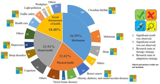 These studies mainly focused on four domains (Figure 4). About 36.59% of them studied the mechanisms of how ALAN may affect human health. The discussions are mainly on the photobiological effects of ALAN on human circadian rhythms, especially melatonin secretion and the sleep-wake cycle. Articles on the effects on human physical and mental health comprise 21.01% and 23.91% of these studies, respectively. The intensively discussed topics on human physical health include breast cancer, obesity, diabetes, and cardiovascular diseases, while there are also some discussions on how vector-borne diseases are tightly linked with ALAN. On the other hand, the intensively discussed topics on mental health include changes in cognition, sleep disorders, and depression. Finally, considering ALAN as a social determinant of health, studies on health care and traffic safety are also very common. Each of these four domains is detailed in the following subsections.