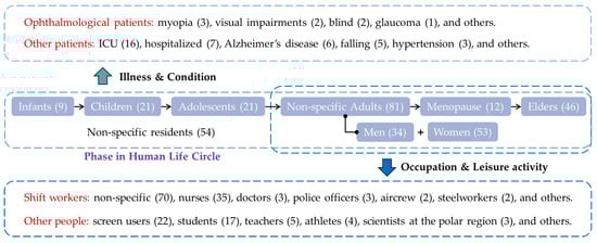 The second classification system emphasizes people’s jobs and leisure activities. Although adults have the strongest resilience to the disturbance of ALAN and its health effects, some groups with sleep deprivation and poor sleep qualities also need attention. The first group comprises various shift workers, whose jobs may require partial or complete sleep deprivation during nighttime work. Nurses are the earliest and most studied shift workers. This group also includes resident physicians, police officers, flight crew, and steelworkers. The other group comprises nighttime screen users, who do not experience sleep deprivation but may face degradation of sleep quality due to ALAN. Studies on nighttime screen users have recently emerged but have drawn increasing attention. The ALAN from computers [63], smartphones [64], iPads [65], or other electronic devices all may lead to the disturbance of people’s circadian rhythms and a phase shift in sleep, which consequentially imposes stress on mental health. Moreover, sleep quality degradation caused by ALAN is also discussed for students [66], teachers [67], athletes [68], scientists in polar regions [69], and other cohorts. For a complete list of relevant studies, please see Supplementary File S1.