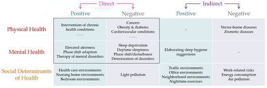 Based on the above systemic review of the literature published in the last two decades, we developed a multi-component framework for drawing a big picture to link ALAN with human health (Figure 6). This framework includes both the direct and indirect effects of ALAN on both the physical and mental health of humans, as well as considering ALAN as a social determinant of human health. Meanwhile, this framework also divides these effects into positive and negative health effects to cover diversified studies.