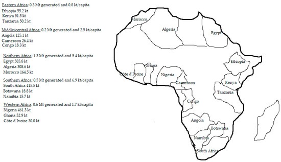 Currently, data on e-waste recycling companies in Africa are old and rare, which can be explained by the lack of transparency of actors in the sector and a sign that the sector is still informal in many countries. In Africa, it is documented that only 0.9% of the 2.9 Mt of generated e-waste [26] was collected in 2019, and it was estimated [26] that, in the same year, 55.2 kt e-waste was generated in Ethiopia, 51.3 kt in Kenya, 50.2 kt in Tanzania (in the east), 125.1 kt in Angola, 26.4 kt in Cameroon, 18.3 kt in Congo (in central), 585.8 kt in Egypt, 308.6 kt in Algeria, 164.5 kt in Morocco (in the north), 415.5 kt in South Africa, 18.8 kt in Botswana, 15.7 kt in Namibia (in the south), 461.3 kt in Nigeria, 52.9 kt in Ghana, and 30.0 kt in Côte d’Ivoire (in the west), among other relevant countries.