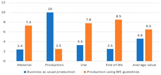To produce a readily understandable outcome, the authors conducted a scaling process, ensuring that the final value of each metric falls between 1 and 10, where 1 signifies poor and 10 signifies excellent sustainability [8]. The evaluation for mobile phones is presented in Table 5. An overview of each metric category’s sustainability for mobile phones is provided in Figure 3.