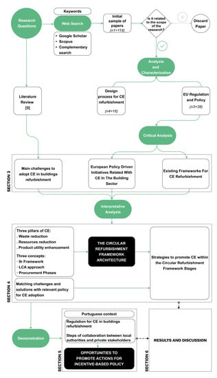 This paper is organized into five sections, including this introduction. Section 2 describes the methodology, Section 4 identifies the state-of-the-art and existing policies towards CE adoption, and Section 4 describes the proposed framework for CE refurbishment and identifies critical steps to promote CE incentive-based policies. The framework is applied to the case study of Portugal in Section 5, and discussion and conclusions are presented in Section 6.