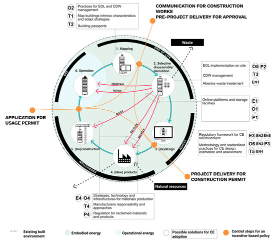 However, some conditions related to the policy dimension need to be met first: new guidelines towards CE for EOL implementation on site, CDW management, and asbestos waste treatment could be developed, eventually by adapting waste regulation [51] to CE prerequisites [35], together with permits, controlling, and monitoring mechanisms (O5, T3, EN1, P2, Table 1). These actions should be complemented with training and raising awareness among construction workers about the reduction of CDW and selective collection of products (O7, S2, Table 1). In addition, online platforms and storage facilities for reclaimed products should be created and updated to enable materials’ reuse, recovery, or recycling (E1, O1, P1, Table 1). In the latter case, the global vision for CE in construction goes beyond these infrastructures with the definition of new vision strategies for CE material production (S1, E4, Table 1).