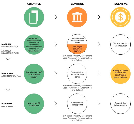 To facilitate CE adoption in building refurbishment, a set of policy actions is proposed along the steps identified, which are interconnected with the construction permit process and utilize existing city hall organization skills and the government tax system. It is concluded that, to provide consistent incentives, it is necessary to first assess and quantify circularity. Time-based incentives, such as priority in project analysis and faster construction permit delivery, are cost-free and only have implications for the organization of local administration services. Moreover, these might be the most valuable incentives, as the process of applying for a construction permit is often very slow. However, tax-based incentives should only be granted to refurbishment projects that have adopted CE principles. Additionally, support actions such as the creation of online platforms for reclaimed materials, proximity storage facilities, training, standardized practices, and a quantitative index for circularity assessment are crucial for the successful implementation of the framework and should be prioritized.