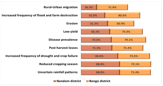 The adverse effects of CC on farmers varied among districts, as shown in Figure 2. In the Nandom district, 88.8% of farmers reported being severely affected by uncertain rainfall patterns and reduction in cropping season, increased frequency of drought and crop failure (84.6%), post-harvest losses (71.3%), disease prevalence (70.1%), low yield (66.3%), erosion (61.3%), and increased frequency of flood and farm destruction (55.0%). Only 36.3% of farmers in the district alluded that rural-urban migration had a severe negative effect. In the Bongo district, 80.6% of farmers were severely affected by increased frequency of flood and farm destruction, disease prevalence (79.1%), low yield (75.4%), increased frequency of drought and crop failure (73.5%), reduction in cropping season (72.0%), uncertain rainfall patterns (71.4%), and post-harvest losses (71.4%). While 70.4% reported rural-urban migration had a severe effect, erosion was also reported to have a severe effect by 60.9% of the farmers in the district.