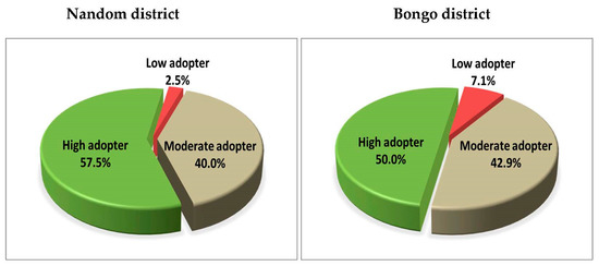 Farmers were classified based on their adoption of 18 selected practices (Appendix D). Those who implemented 1–6 practices were considered low adopters, while those who adopted 7–12 practices were moderate adopters, and those who implemented 13–18 practices were high adopters. Figure 3 shows that, in the Nandom district, 57.5% of farmers were high adopters, 40.0% were moderate adopters, and only 2.5% were low adopters. In the Bongo district, 50.0% of farmers were high adopters, 42.9% were moderate adopters, and 7.1% were low adopters. Overall, the adoption of climate-smart agricultural (CSA) practices was high in both districts.