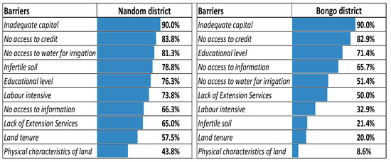 Figure 4 displays the severity of adoption barriers as perceived by farmers. In the Nandom district, farmers faced three major challenges: insufficient capital (90.0%), no access to credit (83.8%), and no access to water for irrigation (81.3%). Although the remaining barriers still posed significant impediments, land tenure (57.5%) and physical characteristics of land (43.8%) were considered minor obstacles. In the Bongo district, inadequate capital (90.0%), no access to credit (82.9%), and low level of educational (71.4%) were also significant barriers to the adoption of CSA practices. Similarly, farmers considered land tenure (20.0%) and the physical characteristics of land (8.6%) as minor obstacles.