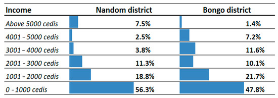 As seen in Figure 6, the average annual income generated by farmers in both districts is heavily skewed towards the lower end. The survey showed that only 25.1% of farmers from the Nandom district and 30.3% in the Bongo district generated an average annual income of more than 2000 GHS (356.67 US dollar, 27 January 2020) from their farming activities. This suggests that most farmers in both districts struggle to generate significant income from farming alone.