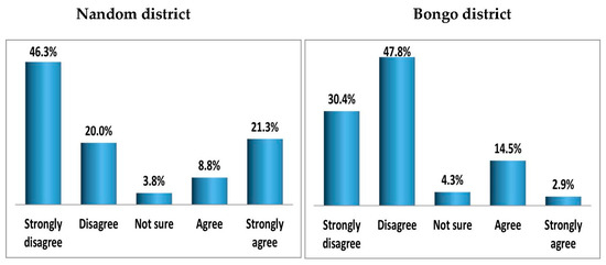 To gain better understanding of the income data presented in Figure 6 and given the differences in household characteristics, it was necessary to assess whether the income generated from farming activities was sufficient to cover all essential household expenses, including education and healthcare. This information is presented in Figure 7. In the Nandom district, 66.3% of farmers (those who strongly disagree and disagree) suggested that farm income is insufficient to meet all essential household expenses. On the other hand, 30.1% (those who strongly agree and agree) believed that it was sufficient. The Bongo district has a high prevalence of farmers whose incomes are insufficient to cover all essential household expenses. Specifically, 78.2% of farmers reported that their farming income was not enough to cover all essential expenses, while only 17.4% believed that their income was sufficient. These findings suggest that a significant proportion of farmers in both districts struggle to make ends meet with the income generated from farming activities alone.