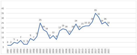 Trends of environmental valuation publications between 1987 and 2021.