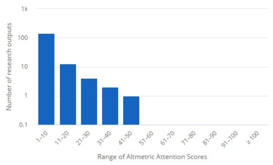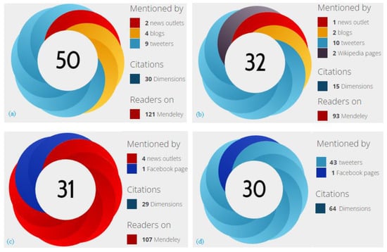 Holmberg et al. [101] used the Altmetric Explorer for institutions to investigate the altmetric activity of open access publications in subscription-based publications for universities in Finland, and found that it delivered good results. The Altmetric Explorer for institutions is an intuitive platform that enables researchers to monitor the online activity surrounding their academic research [69,102,103]. Altmetrics (which means ‘alternative metrics’) are not intended to replace traditional metrics, such as citation count. Rather, they will complement these and allow for a fuller picture of research impact to be understood. According to Altmetric [104], “the database tracks a range of sources to capture and collate this activity, helping you to monitor and report on the attention surrounding the work you care about. Altmetric works behind the scenes, by collecting and collating all of this disparate information. The data is used to provide a single visually engaging and informative view of the online activity surrounding various scholarly contents”.