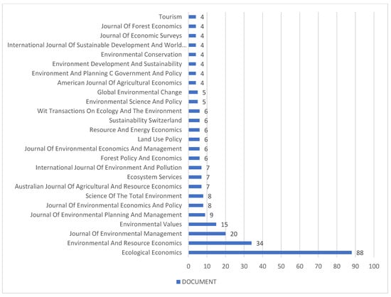 Using Scopus, it was found that one hundred and fifty-eight journals have published research into environmental valuation. Out of this number, 99 (62.69%) have contributed just one article, 22 (13.92%) have contributed two articles and 11 (6.96%) have contributed only three articles. All of these were excluded from further analysis of document sources because of their low number of contributions.