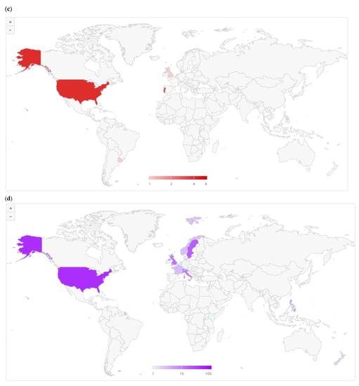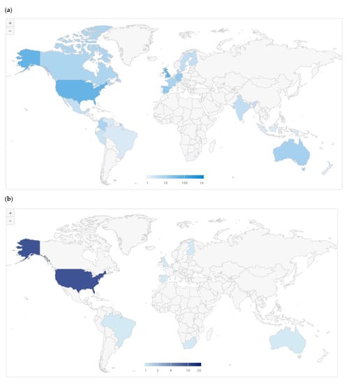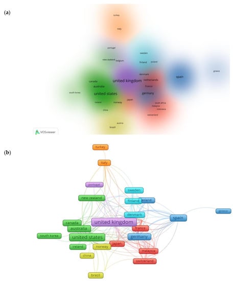 Figure 8a,b shows clusters of countries in terms of co-authorship. Cluster 1, which is depicted in magenta red-coloured profiles, has France, Indonesia, Japan, Malaysia, Mexico, the Netherlands and South Africa. Cluster 2, which is depicted in green-coloured profiles, comprises Austria, Canada, Ireland, New Zealand, South Korea and the United States of America (USA). In Cluster 3, which is depicted in sky blue-coloured profiles, there are Germany, Greece, Poland and Spain. The fourth cluster – Cluster 4 which is depicted in yellow-coloured profiles, incorporates Austria, Brazil, China and Norway. Cluster 5, which is depicted in purple-coloured profiles, has Belgium, Portugal and the United Kingdom (UK). Denmark, Finland and Sweden form Cluster 6, which is depicted in cyan-coloured profiles. Lastly, Cluster 7, which is depicted in dark orange-coloured profiles, comprises Italy and Turkey. It is noteworthy to add that network mapping is useful in identifying the key factors that influence trends in research. It can also be used to determine countries’ levels of productivity on a line of research as well as the promotion of research funding [126]. The size of the nodes represents the extent of each country’s contribution to EV research; consequently, the United Kingdom stands out, followed by the United States. The network lines show the co-citation links between the countries and the thickness of the lines indicate their affinity and strength of association. The network lines can be visualized to present the relationship of the country records and co-citations using the density mapping (as in Figure 8a) and the mapped network (as in Figure 8b). Both visualizations reflect the highest amount of citations on environmental valuation were obtained from the UK, followed by USA, which correlated with the findings in Figure 7.