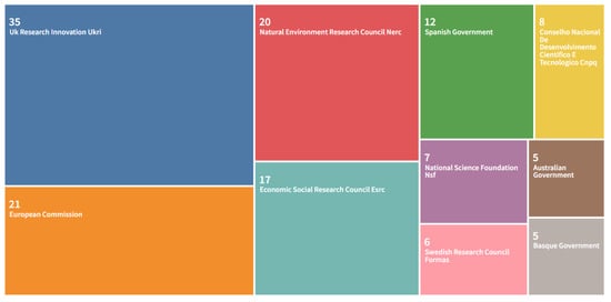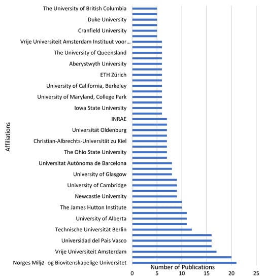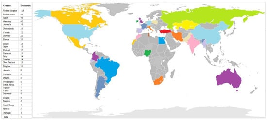 The search criteria for countries’ contributions to environmental valuation research were set at a minimum of five documents and a minimum citation of five. To this end, 30 out of 72 countries fulfilled these criteria and the United Kingdom with 113 documents and 5772 citations topped the list (see Figure 7). The United Kingdom, the United States, Spain, Germany, Australia, the Netherlands, Canada, Norway, France and Brazil were the top 10 countries with 113, 98, 48, 42, 38, 33, 22, 21, 20 and 19, respectively. However, Canada ranked seventh in terms of the number of documents (22), having an average citation record that stood at 125 which is more than twice higher than that of the United Kingdom which had the highest document contribution. In the African continent, only South Africa significantly featured, having seven document contributions with 83 total citations. This implies that there has not been significant investigations in developing countries with regard to their contribution to environmental-valuation-related research, as earlier expressed by Navrud [124] and Wangai et al. [125]. The network mapping of the countries’ collaborations on environmental valuation research determines countries’ levels of productivity on a line of research as well as the promotion of research funding [126].