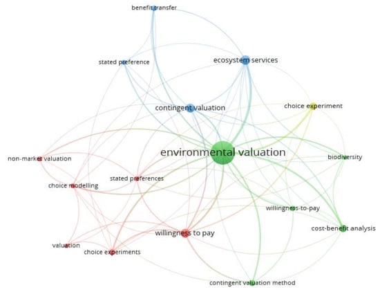 As expected, the results show that “environmental valuation” had the highest occurrence (255 times) in the four hundred and ninety-seven documents extracted with a total link strength of one hundred and fifty-two, indicating its level of involvement in the co-occurrence map. Second in rank is “contingent valuation”, with fifty-four occurrences and a total link strength of 158. This is equally not unexpected as the contingent valuation method has been described as being the most popular method of environmental valuation. It is the most popular method in a family of alternative stated preference techniques [36,37,38]. “Willingness to pay” has 46 occurrences with a total link strength of 59, thus occupying the third position. This keyword is associated with the contingent valuation method, being an approach adopted in engaging the method.