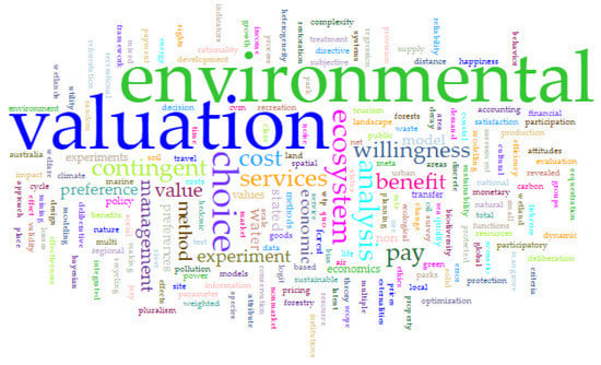 Research into the valuation of environmental assets applying all facets of developed environmental valuation methods to different case studies have covered aspects of recreational sites ([43]), water resources ([44]), flood protection ([45,46,47]), wetlands ([48,49,50,51]), forest plantations ([52,53,54]), air pollution ([55,56,57]) and COVID-19 ([58,59,60,61]). Another area considered in the investigation of research trends in environmental studies is observed in the outputs from different systematic reviews on areas ranging from environmental impacts ([62]), economic concerns in the environment ([63]), agricultural–ecological compensations ([64]) and ecotoxicological effects ([65]). Aside from these, different measurement tools have been identified by various researchers in EV ([66,67]).