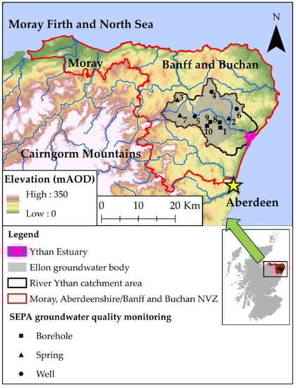 - Simpson, E.M. Mapping Groundwater Vulnerability of the Ythan Catchment. Bachelor’s Thesis, University of Aberdeen, Aberdeen, UK, January 2022. [Google Scholar]