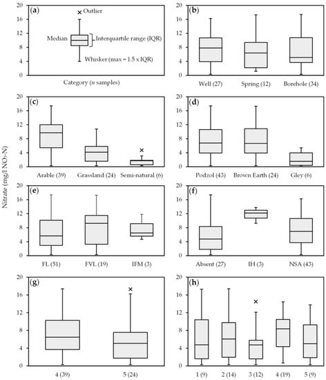 - Begum, S.; Adnan, M.; McClean, C.J.; Cresser, M.S. A critical re-evaluation of controls on spatial and seasonal variations in nitrate concentrations in river waters throughout the River Derwent catchment in North Yorkshire, UK. Environ. Monit. Assess. 2016, 188, 305. [Google Scholar] [CrossRef]