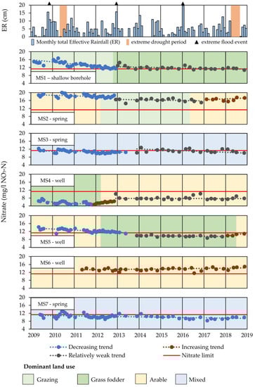 4.3. Groundwater Nitrate Trends and Relation to Climate and Land Use Changes