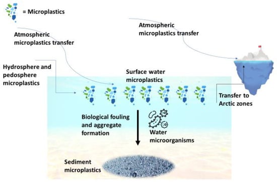 Another distribution pathway is vertical distribution, where heavier microplastics sink to the water bed including seabeds, riverbeds, and ocean beds. Vertical distribution in the hydrosphere includes vertical turbulent mixing, which is governed by the water velocity and flow of direction; biota transfer, which depends on the movement of aquatic organisms; biological fouling and aggregate/cluster formation, which is governed by the presence of organisms present in the hydrosphere including microorganisms, bacteria, plankton, and algae [32,60,61]. Biological fouling and aggregate formation are affected by a number of factors such as microplastic characteristics (type, chemical composition, surface morphology) as well as hydrosphere characteristics (temperature, pH, types of microbes present) [62,63,64,65]. For example, in the Arabian Gulf, the surfaces of PET and PE microplastics underwent biofouling as a result of the presence of different microbes and plankton [66]. The process of biological fouling mainly comprises three steps: first, the microbes and nutrients present in the hydrosphere attach to the microplastic’s surface [67]; subsequently, extracellular polymeric substances are released by the microorganisms to form a biofilm that further attracts other marine invertebrates and aquatic life; second, the attached microbes release extracellular polymeric substances (EPS) to further attract more microbes and nutrients [68]; finally, a clustered mass of microplastics with flocculant and nutrients eventually becomes denser and sinks to the bottom.