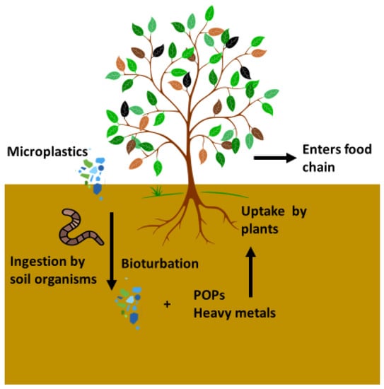 The fate and transport of microplastics in the soil are not well-reported. The movement of MPs in the soil is complex and is primarily governed by bioturbation (i.e., the transfer of microplastics from the surface soil into deeper layers) (Figure 2) [91]. Bioturbation is mediated by soil fauna such as earthworms, soil larvae, and vertebrates (e.g., moles, mice, snakes, and rabbits). These soil faunae can mediate soil vertical mixing via burrowing actions (mimicking a mechanical mechanism) or by ingesting the microplastics and translocating them into deeper soils while moving downward [91,92]. Several experimental studies show the transport of microplastics in the soil via bioturbation. For example, Zhu et al. [93] reported that the scraping and chewing actions of mites and collembola on plastics resulted in the migration and transport of MPs in the soil. Earthworms result in the migration of MPs both by external attachment as well as an internal attachment (via ingestions and excretion), thus facilitating the lateral and vertical transport of MPs in the soil [92,94]. Other routes of MP transport in the soil include root movement and expansion [91,95], tillage activities [96], and the harvest of tuber crops such as potatoes and carrots. The downward movement of microplastics would also be influenced by several parameters including the wetting–drying cycle, soil pore space, soil type, moisture content, precipitation, temperature, and leaching [97,98]. The shape, size, and composition of the microplastics also determine their transport in the soil. Certain microplastics such as polystyrene can form aggregates with soil under the influence of soil organic carbon, pH, and the cation exchange capacity of the soil [99,100]. However, more research is needed to gain deeper insights into the influence of soil properties and external factors on the migration of MPs in the soil.
