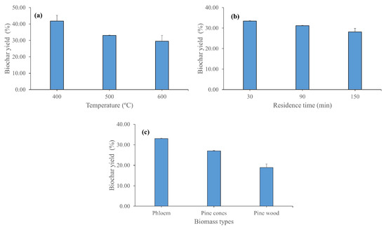 - The biochar yield of Quercus cerris phloem under moderate temperatures (400–600 °C) ranges between 28% and 42%.
