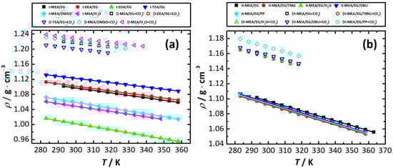 Densities (ρ) of neat (solid symbols) and CO2-saturated (open symbols) mixtures of Series I (a) and Series II (b) as a function of temperature (T). Lines are a result of the fit with Equation (3).