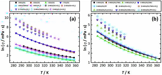Logarithmic viscosities (ln η) of neat (solid symbols) and CO2-saturated (open symbols) mixtures of Series I (a) and Series II (b) as a function of temperature (T). The lines are a result of the fit with Equation (4).