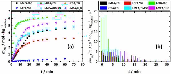 While the for the I-MEA/DMSO system is close to that of I-MEA/EG, I-MEA/H2O demonstrates a 21% higher CO2 absorption capacity. Obviously, from the point of view of the mass/moles of the absorbed gas, the system I-MEA/H2O is the most promising within Series I. However, as discussed in the literature [], H2O-based amine solutions are rather volatile. When volatility is considered as an important parameter for the choice of the absorbing solution, the I-MEA/EG system is more attractive, despite showing a 17% lower absorption capacity compared to I-MEA/H2O. Interestingly, the amine efficiency () (Figure 5a) values of I-MEA/EG, I-DEA/EG, and I-MEA/H2O are the same, within the error of estimation. For I-MEA/DMSO, the is approximately 10% higher, which indicates a favorable contribution of DMSO to amine efficiency. The EDA-based system (I-EDA/EG) shows and values that are almost 40% higher in comparison with I-MEA/EG. Indeed, this finding is in good agreement with the data from the literature [,].The absorption rate for I-EDA/EG reaches 95% of its maximum in only 10 min. Certainly, these characteristics make the I-EDA/EG mixture the most promising among the studied systems for efficient CO2 capture. However, in the CO2-saturated I-EDA/EG sample, a precipitate is formed, which results in full solution solidification. Thus, despite the good absorption properties of the EG-based mixture containing EDA, its practical applicability is quite doubtful.