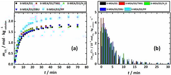 Figure 4a,b display absorption profiles and absorption rates (), respectively, for Series II systems, i.e., the neat mixture MEA/EG/ChCl with , , and (II-MEA/EG), and mixture II-MEA/EG containing 5 wt. % of promoters. Figure 5 shows the corresponding CO2 absorption capacities () and amine efficiency ().