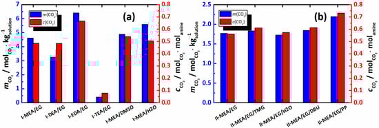 Due to their rather high liquid–gas transition temperatures, deep eutectic solvents (DESs) can be also considered as HBP solvents []. A diversity of possible combinations of starting materials, along with a hydrogen bond donor (HBD) and a hydrogen bond acceptor (HBA) in an appropriate molar ratio, provide powerful tools to control the properties of DESs and natural deep eutectic solvents (NADESs) [] in accordance with their applications, including, among many others, pharmaceutical synthesis [], band gap systems [,], and CO2 capture [,,,]. Despite their absorption characteristics being inferior to conventional amine solutions, the systems in which DESs are mixed with amines or DESs comprising amines as HBDs are of particular interest when the optimization of the CO2 absorption technology is considered. Surprisingly, a thorough literature search revealed only a few publications that provide a detailed study of the effect of the mixture of components, their ratio, the nature of amine, etc., on carbon dioxide capture by amine-based DESs and amine/DES mixtures [,,,,,].