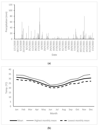 (a) Daily precipitation over the study period (b) and average monthly temperature. Source: Bureau of Meteorology [11].