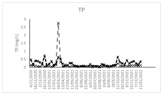 Table 2 shows the summary statistics of the monitored parameters over the study period. The data suggest that the wetland receives high-quality treated wastewater from the MBR process. There is no evidence of significant differences between the mean values of inflow and effluent water parameters, p = 0.188. Nevertheless, there is strong evidence that the constructed wetland reduced the total nitrogen concentration (p < 0.001), particularly the oxidized forms of nitrogen (NOx, p < 0.001) and ammonium. The ammonium concentration in the effluent was well below any trigger concentration (<1.88 mg/L at pH 7.3) [13]. The data suggest a slight increase in total phosphorus and ortho-phosphate concentrations, although the increase was not statistically significant (p = 0.264). The spike in TP concentration usually followed wet weather conditions, as shown in Figure 3, thus suggesting that pre-deposited phosphorus was flushed. Such behavior has been reported in the literature and is referred to as the re-setting mechanism [14]. The constructed wetland system showed good evidence of handling surges of TP load, as shown from the 16/03/2021 event, where the system reduced the TP concentration by 77.5% from 2.75 to 0.62 mg-P/L.