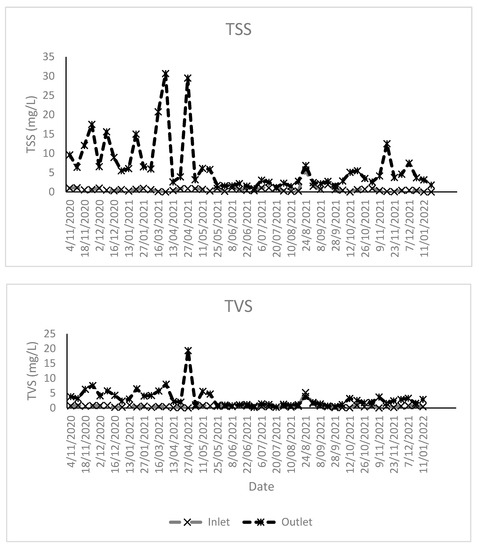 A strong correlation was observed between TN and TVS in the effluent (R = 0.89), explaining nearly 79% of the variability in TN. This observation is consistent with the fact that most of the TN in the effluent is in organic form. The system (plants and microbes) can uptake the available nutrients and incorporate them into biomass, as evident from the increased organic nitrogen in the effluent. However, when the nitrogen levels are too low in the influent, the wetland is unable to reduce it further (threshold concentration). In such a case, the removal efficiency is reduced, and some of the previously removed nitrogen can be released into the system as observed on some occasions, as shown in Figure 4.
