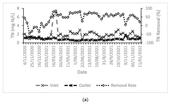 The average TN concentration in the influent was around 1.97 mg-N/L, although this fluctuated considerably (standard deviation = 1.09). The highest TN concentration in the influent was 7.2 mg-N/L. On average, organic nitrogen constituted around 34% of the TN in the influent. The average TN in the effluent was 0.83 mg-N/L, of which 96% is organic nitrogen. The constructed wetland showed a good removal capacity of total nitrogen; based on the inlet-outlet concentrations, on average, the TN concentration reduction was 54%. This is mainly due to the high efficiency of removing oxidized forms of nitrogen and ammonium (from 92 to 100%). The observed NOx and ammonium removal rates were higher than commonly reported in the literature, e.g., [2,4]. Nevertheless, Beutel, Newton [21] reported a nitrate concentration reduction of 94% in a constructed wetland treating diluted agricultural runoff. The carbon-to-nitrogen ratio (C:N) is an important factor affecting TN removal. Li, Liu [22] reported that maximum nitrogen removal can be achieved at a 5:1 C:N ratio. Although the organic load was low (average BOD < 5 mg/L), plant biomass provides the needed carbon to maintain the C:N ratio required for the nitrogen removal [23]. The high NOx and NH4 removal efficiency is attributed to the low nitrogen loading rate coupled with favorable temperatures and retention time as well as plant uptake. Figure 4a shows the influent and effluent concentration as well as the removal rates. An initial erratic period (before 16 December 2020) was observed, which can be attributed to the establishment phase (the wetland was still in the early stages and received very low flows) in addition to an extended drought period. However, after the initial establishment phase, a positive correlation between the removal rate and the influent concentrations can be observed. This correlation is more obvious when considering the nitrogen-loading rate, as shown in Figure 4b,c. Figure 4c reveals a saturation curve with the removal rate increasing rapidly in the beginning but slowing down as it approaches the maximum capacity. The inflection point occurs around 0.69 kg-N/month·m2, thus suggesting that optimal performance can be achieved by maintaining a loading rate higher than 0.69 kg-N/month·m2.