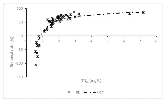The TN removal was satisfactorily fitted to the K-C* model (R2 = 0.80 and RMSE = 6.38), as shown in Figure 4c. The K-C* model suggests that the constructed wetland has an irreducible nitrogen load threshold of 0.115 kg/month·m2.