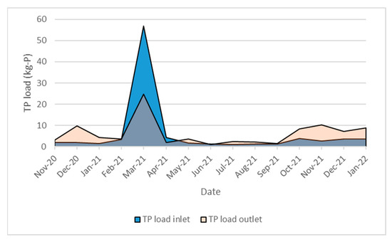 As the retention period is significantly high (influent > effluent), the phosphorus can be held in the system and later flushed out when the hydraulic loads increase or when the concentrations fall below threshold levels. Figure 6 shows that the system stored phosphorus when loads were high and released it later. The spikes in TP concentrations during wet weather further support this hypothesis, Figure 3a. However, it is important to note that the system has been able to cope with spikes in phosphorus concentrations, reducing the concentration by 78% and the load by 57%. Additionally, the pH of the effluent remained within a tight range of around 7.25, where H2PO4− and HPO42− are the dominant forms, which indicates that phosphate is mainly in soluble forms. The apparent low efficiency in TP removal is likely because most of the incoming phosphorus is in the ortho-phosphate form. Surface flow-constructed wetlands are more efficient in removing particulate phosphate [7].