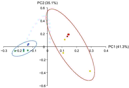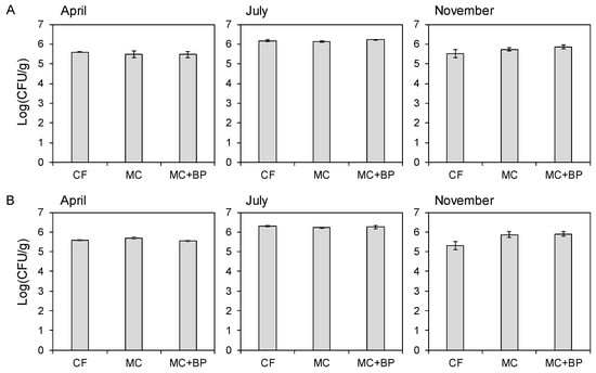 The long-term different material applications affected the soil beta diversity. It has been shown that the application of CFs did not influence any type of microbial communities in soil []. In this study, this tendency could be reproduced in the paddy soil in winter, where CF has been applied since 1991. In addition, the long-term CF application caused a decrease in bacterial diversity in soil []. These reports, together with the result of this study, have indicated no effect or negative effect of CF application to the crop field soil on the formation of a diverse group of organisms. Therefore, the difference in the bacterial community structure between the MC- and CF-applied soils might be regarded as a dynamic feature of the soil bacterial microbiota in response to the MC application.