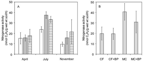 Effects of sampling months and different material applications on the potential nitrogenase activity in soil bacteria. The nitrogenase activity was measured using soils collected from CF (open columns), MC (gray columns), and MC + BP (hatched columns) plots in 2018 (A) and July 2019 (B). A column with an error bar indicates a mean ± SD.