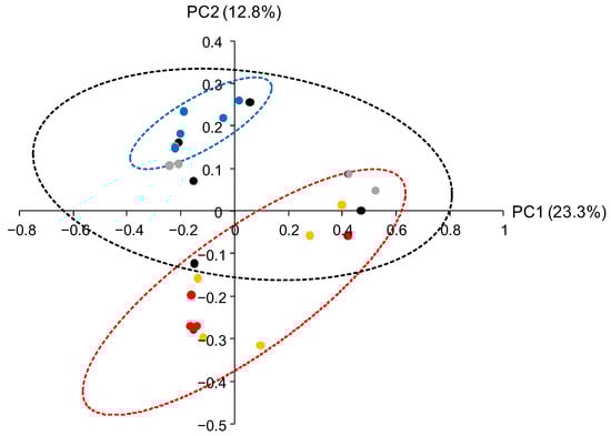 PCoA of the soil bacterial microbiota in February 2023. Coordinate points for CF (blue), MC (red), MC + BP (yellow), NF (black), and NF + SP (gray) microbiota are depicted. The dotted drawings show 95% confidence ellipses for CF (blue), MC and MC + BP (red), and NF and NF + SP (black).
