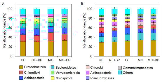 The differences in the relative taxonomic abundances were compared with the soil bacterial microbiota observed in CF- and MC-applied fields in July 2019 and February 2023. The phylum abundance of Nitrospirota was lower in the microbiota of MC and MC + BP soils than in those of the CF and CF + BP soils in July (Figure 6A). In the microbiota of the MC soil, the abundance of Chlorobi decreased, whereas the abundance of Chloroflexi and Actinobacteria increased compared to those in the CF, CF + BP, and MC + BP soils. These tendencies in the phylum abundances of Nitrospirota, Chlorobi, Chloroflexi, and Actinobacteria were observed in the microbiota of CF- and MC-applied fields in February (Figure 6B).