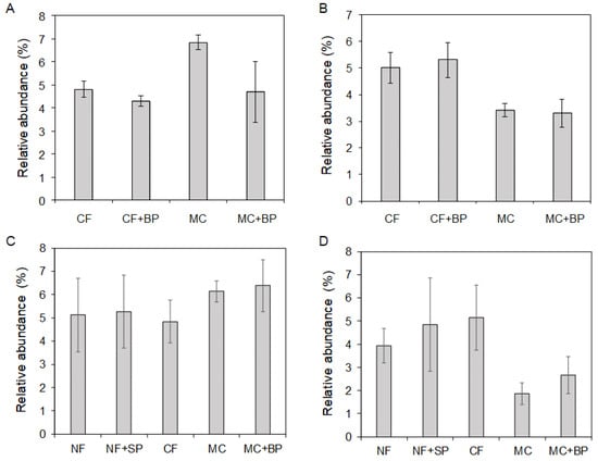 Marked differences in the relative abundances of alpha-Proteobacteria (Figure 7A) and Nitrospira (Figure 7B) classes were observed in CF- and MC-applied fields in July. In the class alpha-Proteobacteria, the abundance was higher in the MC microbiota than in the CF and CF + BP microbiota. The MC microbiota had a lower abundance of Nitrospira than those in the CF and CF + BP microbiota. The abundance of Nitrospira also decreased in the MC + BP plot compared to those in the CF and CF + BP plots. Increases in Anaerolineae and delta-Proteobacteria and decreases in beta-Proteobacteria, Acidobacteria, and BSV26 detected in the anoxic rice paddy soil [] were observed in the MC microbiota compared to the CF + BP microbiota. The MC and MC + BP microbiota had lower abundances of gamma-Proteobacteria than those in the CF and CF + BP microbiota. The class abundance also tended to increase in alpha-Proteobacteria (Figure 7C) and decreased in Nitrospira (Figure 7D) in the microbiota of the MC-applied field in February as observed in those in July.