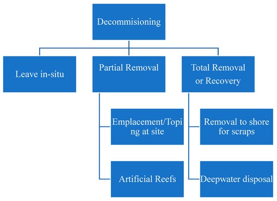 There are three possible options or actions for decommissioning activities, as shown in Figure 1. The decommissioning options are (i) leave in-situ—the structures can only be left in situ after the necessary removal and cleaning of hydrocarbons; (ii) partial removal—the structures are being partially dismantled and buried onto the seabed within the zone of the operational structure and (iii) total removal or recovery—this option includes the removal and transportation of the structures to shore [23,24]. Upon arrival, the structures will be dismantled, re-processed, or sent to the landfill for further processing or burial. Ref. [20] suggested decommissioning options, including full and partial removal, trenching, and burial of the pipelines. The stability of subsea infrastructure is frequently improved over time as a result of changes in the strength and bathymetry of the seabed brought on by consolidation and sediment movement, which is a recurring issue in emergent research. When developed into trustworthy and widely used forecasting models, this discovery supports in situ decommissioning instead of removal.